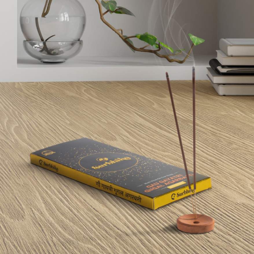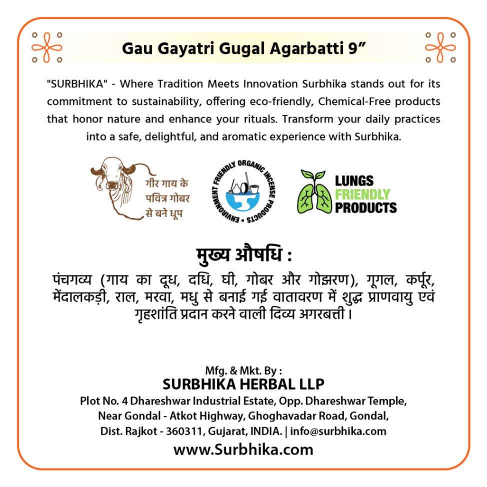 The GAU GAYATRI GUGAL AGARBATTI, a fascinating product of Surbhika, is an attractive fragrance producing incense stick made of fine Gir cow dung and medicinal herbals being its superior vibe maker along with Panchagavya (cow’s milk, curd, ghee, cow dung, gaujaran) maidalkadi, camphor, gugal, agarwood, resin, marjoram, etc., The importance of Gomata remains sustained in one’s life in the presence of GAU GAYATRI GUGAL INCENSE STICKS.