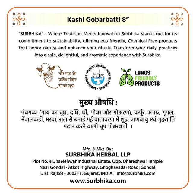 Kashi Gobarbatti is made from panchgavya and natural base material. Its completly Charcoal free and safe for family and pets. Kashi Abarbatti produces calming light smoke with liking aroma. available in affordable zipper pouch pack of 101 Kashi incense sticks. This is one of the most recomended product from Surbhika.