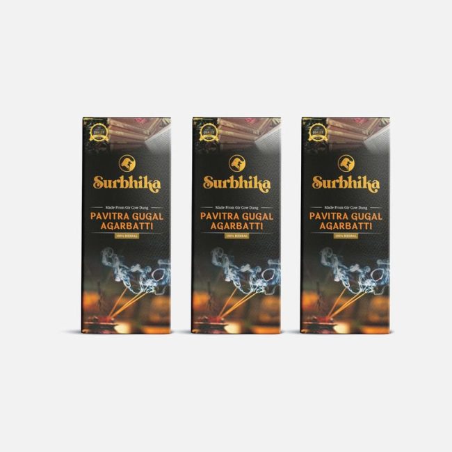 Surbhika Pavitra Gugal Premium Incense Sticks (Pack of 3) @ just rs. 311 Now !  Discover the divine essence of Surbhika Pavitra Gugal Premium Agarbatti, meticulously crafted to enhance your spiritual rituals and create a serene ambiance in your home. Made with the purest Gugal Resin, Gir Cow Dung Resin, Panchgavya, Kapur, Raal, Amala, Honey, Jatamansi, Javantri and a blend of natural herbs. these agarbattis emit a rich, soothing fragrance that lingers, fostering an atmosphere of peace and tranquility.
